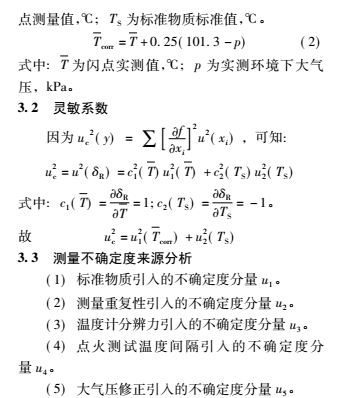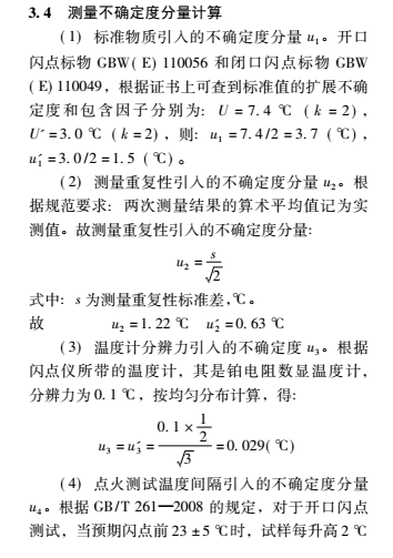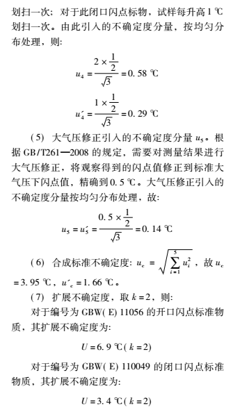通過評定可得,開口 / 閉口閃點(diǎn)測定儀的不確定度主要來源于標(biāo)準(zhǔn)物質(zhì)、重復(fù)性測量及點(diǎn)火測溫間隔引入的不確定度,溫度計(jì)顯示和大氣壓修正引入的標(biāo)準(zhǔn)不確定度較小。